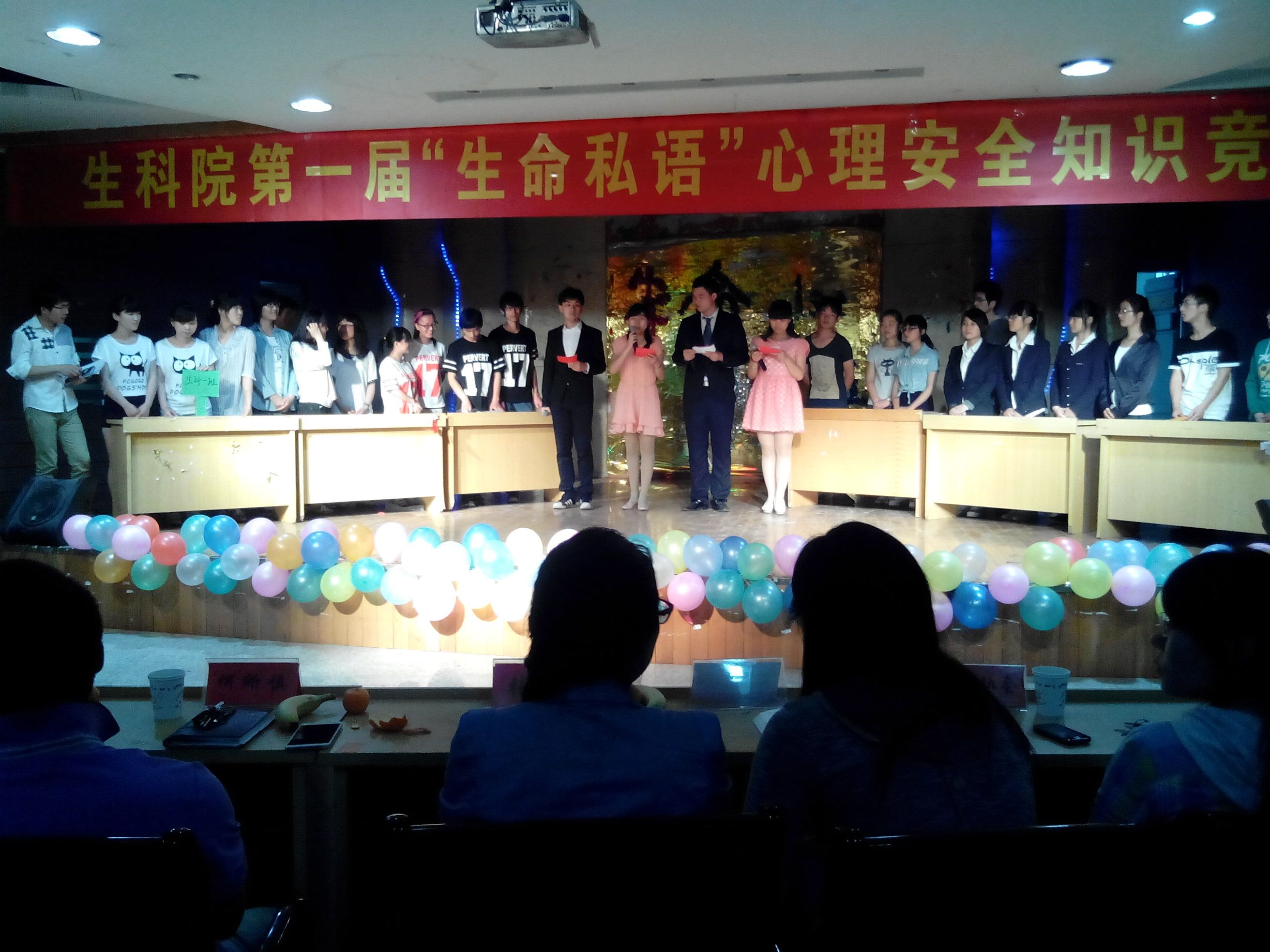 5月17日,生科院2013级各专业于赭山校区团委多功能厅联合开展了第一届“生命私语”心理知识竞赛。6个班级的代表赛前积极充分准备,现场发挥更是临危不乱,气氛愉悦,表现优异。最终,2013级生态学专业代表队夺得桂冠。同学们纷纷表示此次比赛不仅拓展了心理安全知识,也意识到自己应更加重视大学生的心理健康问题,在大学学习生活中更好地保持身心健康。”
